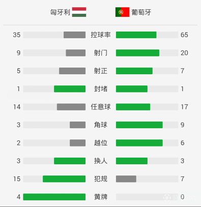 第6分钟,马里奥禁区外凌空抽射,皮球打高出了横梁。第7分钟,匈牙利左路传中,绍洛伊的门前抢点稍慢一步,被后卫将球挡出。第8分钟,葡萄牙的前场左路角球机会,佩佩的前点头球攻门没能发上力量,被门将没收。
