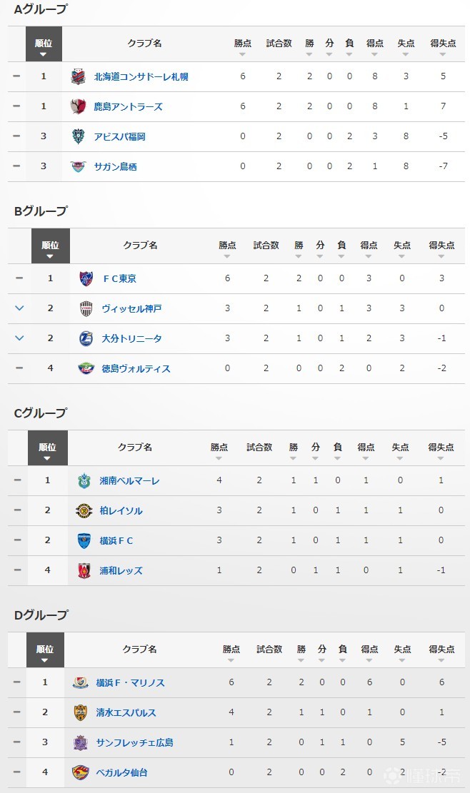 ※本赛季日联杯规则简介:本赛季日联杯分小组赛和淘汰赛两阶段。小组赛分为四组,共16支球队进行双循环对抗,其中14支是上赛季没有获得亚冠资格的J1球队,另外2支是本赛季的升班马。每组前两名进入淘汰赛。参加亚冠的川崎前锋、大阪钢巴、名古屋鲸鱼和大阪樱花(资格赛)将在四强出炉后参战。