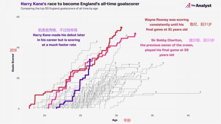 也许更有用的比较是看他目前的进球轨迹,以及英格兰队同龄人的进球轨迹。这将有助于更好地描绘凯恩未来所肩负的任务。