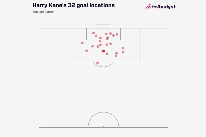 现在说说细节。下面我们可以看到,凯恩的英格兰队进球都集中在点球点及其附近。其中有9个进球来自点球本身,而只有一个来自禁区外。虽然这是一个相对较小的样本,但这的确反映了他在英格兰队的作用有些不同于我们经常看到的热刺队长在较远距离终结的情况。在英格兰队中,凯恩身后有大量的创造性球员,所以他可以更专注于处理来自队友的传球。