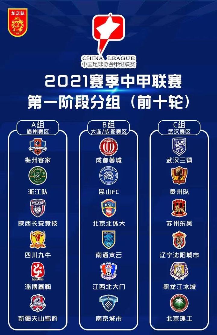 本赛季中甲比赛于4月24日开始,将以赛会制形式分四阶段进行,双循环打满34轮(10轮+8轮+8轮+8轮),B组大连-成都赛区前两阶段大连,三四阶段成都分别承办18和16轮比赛。 第一阶段将三个承办地会员协会下属的俱乐部设为东道主队(成都蓉城、梅州客家、武汉三镇),三支种子队通过落位抽签确定落位A、B、C三组。其余15支球队按照2020年联赛排名进行蛇形排列,直接定位在A、B、C三组,每个组在一个赛区,每个赛区6支球队,进行双循环10轮、共90场比赛。