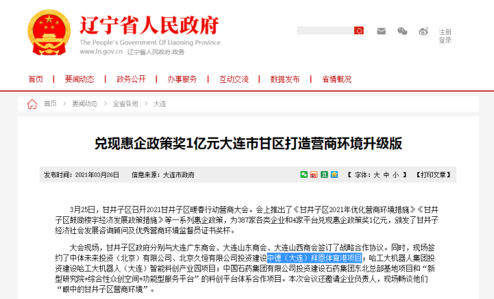 大连市政府发布:甘井子区签约中体未来投资(北京)有限公司、北京久恒有限公司投资建设中德(大连)拜恩体育港项目。