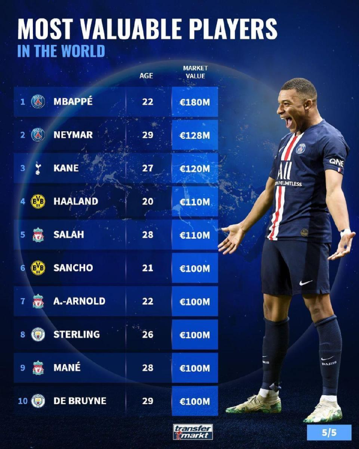 最新球员身价TOP10,4个英格兰人,无皇萨仁球员上榜