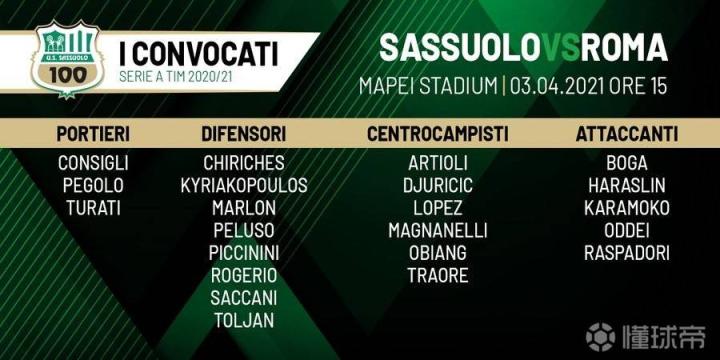 萨索洛本场大名单:绿巴萨还将延续上轮对阵罗马时的大名单。