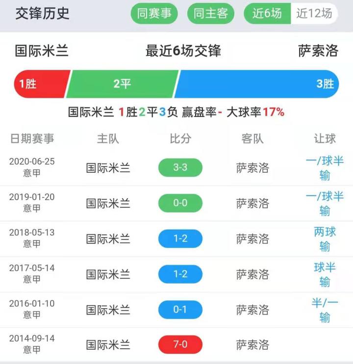 自从2014年,国米主场7-0战胜萨索洛之后,近五场国米主场对阵绿巴萨非平即负,2平3负,未有一胜。。。