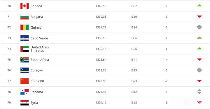 FIFA最新世界排名:国足降至全球第77,被佛得角和库拉索超越