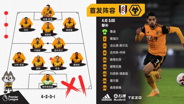 英格兰狼队足球俱乐部北京时间4月10日03:00,英超第31轮,狼队在伦敦客场迎战富勒姆。自从努诺接手狼队后,双方在英冠英超赛场有过5次交锋,我狼3胜1平1负占据优势。