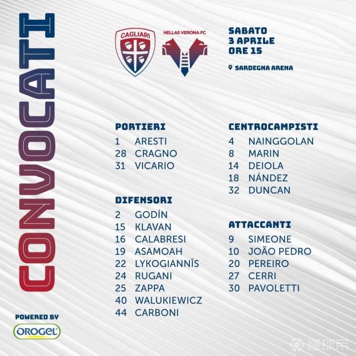 卡利亚里本场大名单:撒丁岛球队还将延续上轮对阵维罗纳时的大名单。