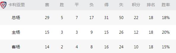 卡利亚里目前客场联赛成绩2胜4平8负,取得10分。进16球,场均1.14。失球24个,场均1.71。