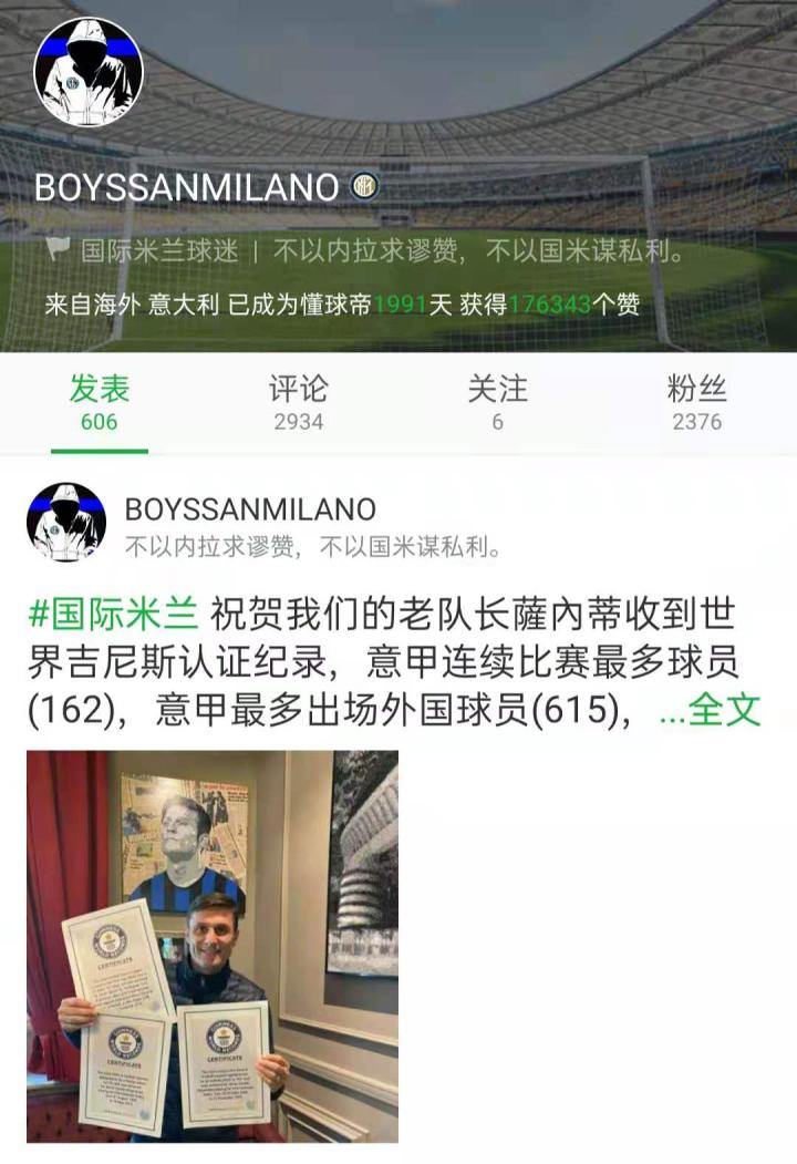 他也是懂球帝上一位支持国米方面的创造者。一位国米死忠,一位骨子里的内拉祖里。