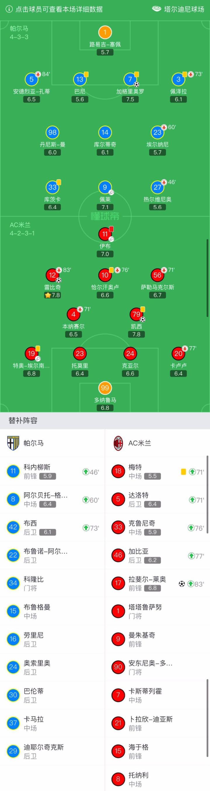 帕尔马首发:1-路易吉-塞佩、5-安德烈亚-孔蒂(84`特拉奥雷)、13-巴尼、7-加格里奥罗、3-佩泽拉(73`42-布西)、33-库茨卡、23-埃尔纳尼(60`8-阿尔贝托-格拉西)、14-库尔蒂奇、15-丹尼斯-曼、9-佩莱、27-热尔维尼奥(46`11-科内柳斯)