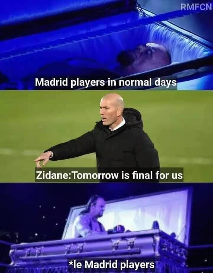 Madridista(皇马球迷):记者问,为什么在这样的比赛中皇马总会赢?齐达内说,我只是给他们说这是决赛(Reporter : How Real Madrid always win in such games? Zidane : I just told my players all matchs are finals)。