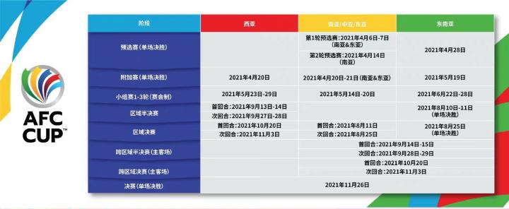 亚足联杯中亚区小组赛也将于5月14-20日进行,两个小组第一于8月11和25日进行两回合主客场比赛决出中亚区冠军参加大东亚区跨区半决赛。