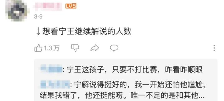 他们表示“宁王来一次说了许多平日里解说不敢说的话”。还对宁王说,相信观众们还没有看够解说台上的你。