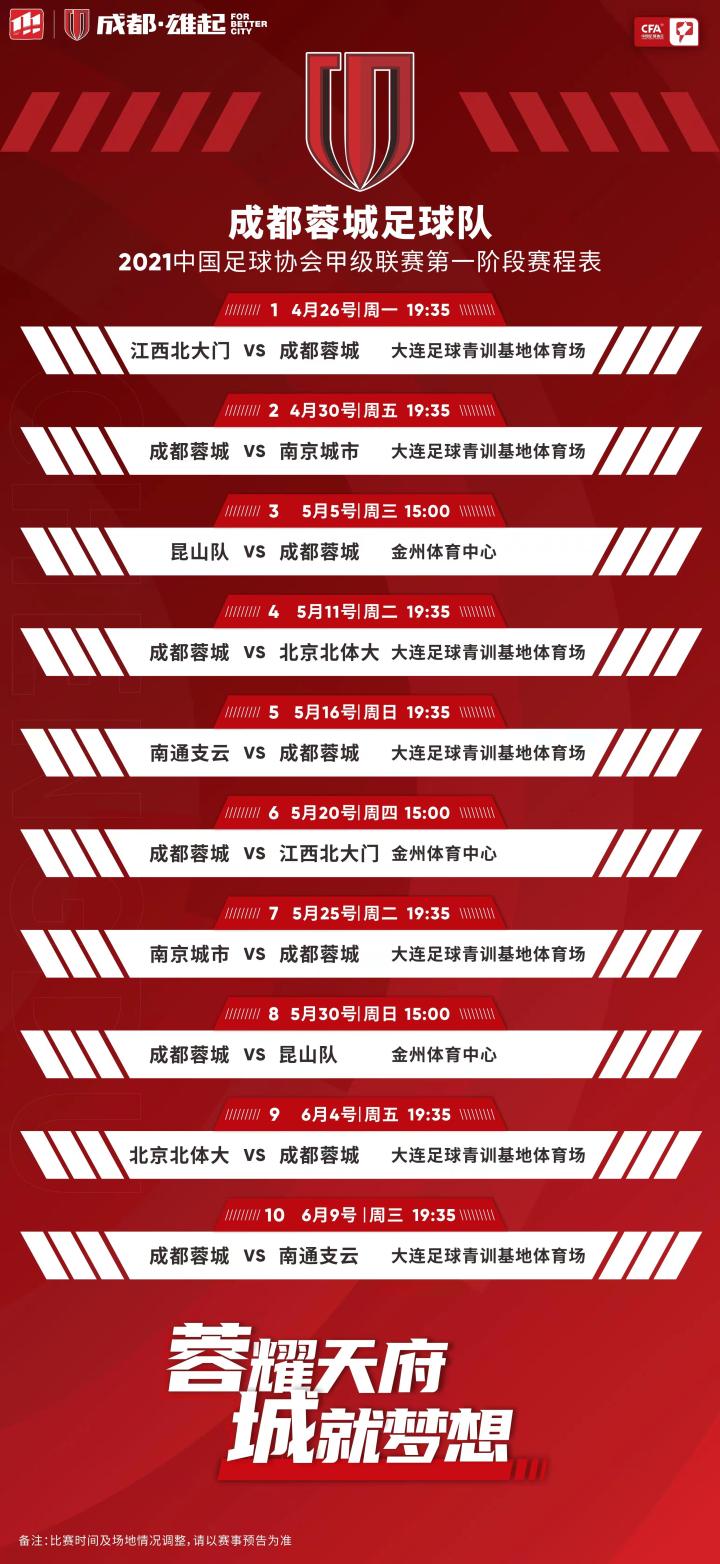 2021中甲联赛成都蓉城队第一阶段赛程表来啦!成...成都蓉城足球俱乐部2021-04-13 16:022021中甲联赛成都蓉城队第一阶段赛程表来啦! 成都蓉城队将在大连赛区进行第一阶段的十轮比赛。4月26日19:35,我们将迎来本赛季首战,对手是江西北大门。 联赛开战在即,成都蓉城队蓄势待发!展开更多