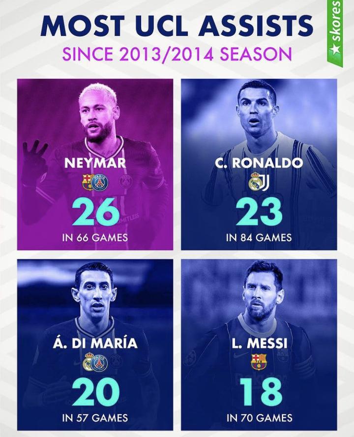 【数说足球】自2013/14赛季以来欧冠联赛助攻...Laoshu @懂球帝2021-04-13 20:13【数说足球】自2013/14赛季以来欧冠联赛助攻排名 1、内马尔 26次(66场)巴萨/大巴黎; 2、C罗 23次(84场)皇马/尤文; 3、迪马利亚 20次(57场)皇马/大巴黎; 4、梅西 18次(70场)巴萨;展开更多