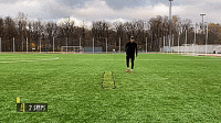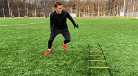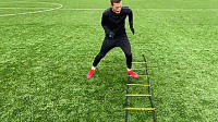 第三个训练是横向两步加单脚跳跃,我们从敏捷梯一端开始。