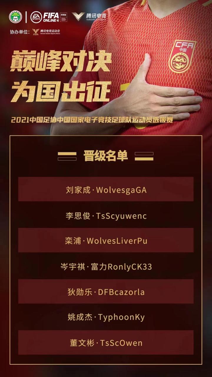选拔赛狼队电竞FIFA战队四名选手悉数出战,刘家成代表广东省队、栾浦和卢映挂靠四川省队,于晓波则代表海南省队。从4月8日开始,经过3天线上选拔,刘家成(GA)、于晓波(Qiu)、栾浦(Liverpu)在初赛阶段表现优异,晋级在北京举行的14进7决赛。而在12日的线下决赛中,刘家成2-0战胜王俊,栾浦2-1战胜了李振兴,于晓波则是1-2惜败姚成杰。