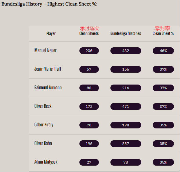 我们还可以通过观察诺伊尔惊人的零封率来强调他在德甲的统治力。德国第一门将在他的德甲联赛生涯中几乎有一半的比赛保持了零封(200/432,46%)。而在其他所有至少参加过50场德甲比赛的门将中,没有一位门将的零封率能高于37%。