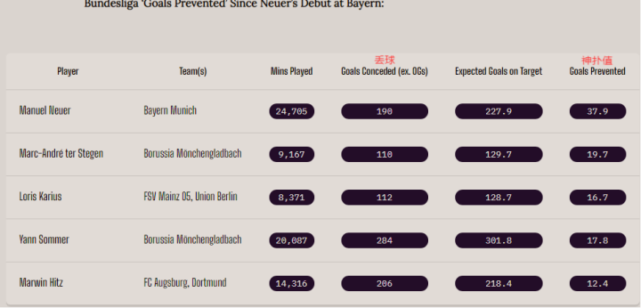 自诺伊尔在拜仁出道以来,他的神扑值在所有德甲门将中遥遥领先,而且差距还不小。自2011年以来,诺伊尔的神扑值比一般门将多出近40个。下一位是马克-安德烈-特尔施特根,他在门兴格拉德巴赫的四年时间里的神扑值大约为20。
