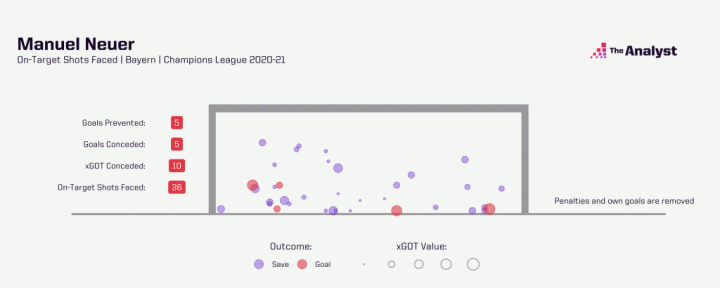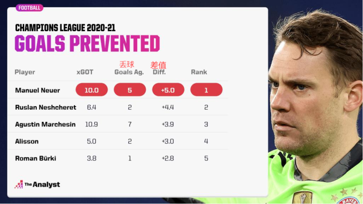 虽然现在已经30多岁,但德国人的表现仍然是精英级别的。在本赛季的欧冠中,打巴黎之前诺伊尔只丢了5个球,但他面对的射门质量(再次使用我们的朋友xGOT)表明,他应该丢球于这个数字的两倍,但事实是诺伊尔的水平依然在线(当然打巴黎的比赛可能有些意外)。