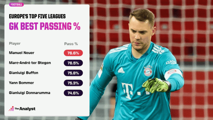 德国人对于处理脚下球早已驾轻就熟。自2006-07赛季开始,诺伊尔的传球准确率在欧洲五大联赛所有参加过150场比赛的门将中是最高的。(当然现在有几位年轻的门将把传球成功率又提上了一个台阶)