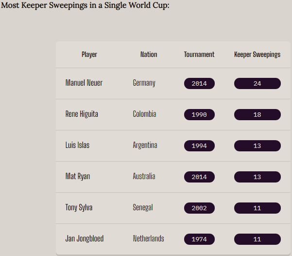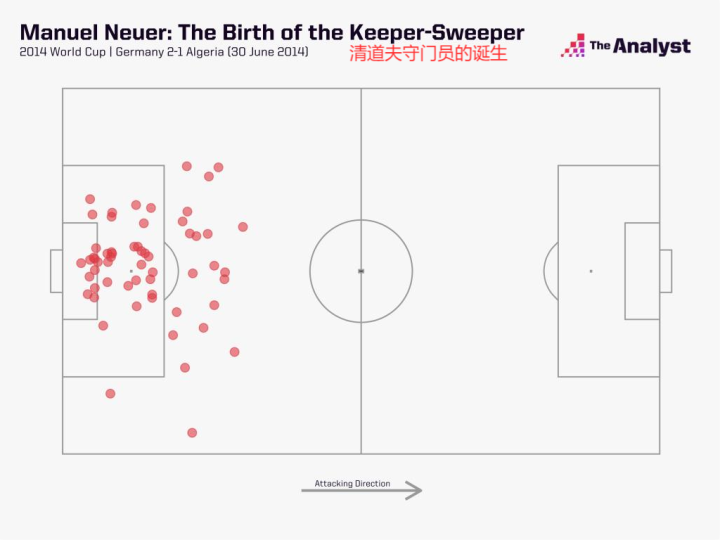 在整个2014年世界杯中,诺伊尔扮演了24次“清道夫”,比1966年以来(我们有详细数据记录的赛事可回溯到1966年)任何一位门将在单届赛事中的次数都要多。