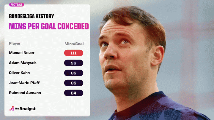 让我们把这个纪录分解成更直观点的数字。在整个德甲生涯中,诺伊尔每111分钟才会丢一球。这是迄今为止在德甲历史上所有至少踢了1000分钟的门将中最好的。