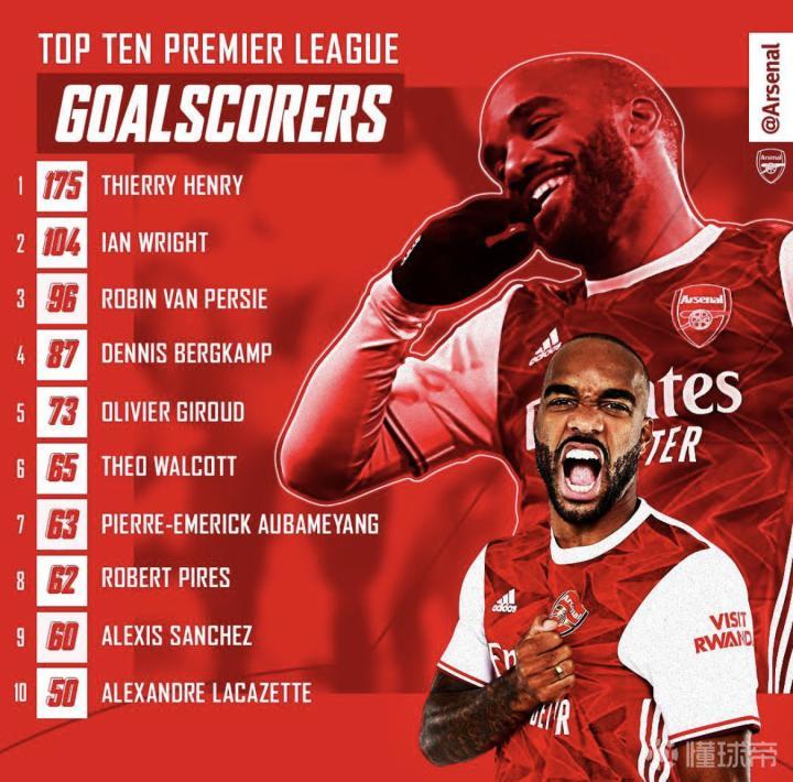 阿森纳球员(现役+退役)中英超进球50+的球员1...侃球的欧豆豆 @懂球帝2021-04-14 15:22阿森纳球员(现役+退役)中英超进球50+的球员 1.亨利-175球 2.伊恩·赖特-104球 3.范佩西-96球 4.博格坎普-87球 5.吉鲁-73球 6.沃尔科特-65球 7.奥巴梅扬-63球 8.皮雷-62球 9.桑切斯-60球 10.拉卡泽特-50球展开更多