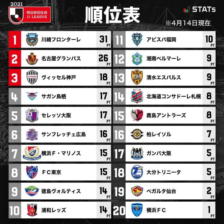 北京时间4月14日,2021赛季J1联赛第18轮和第19轮的四场提前进行的比赛全部结束。川崎前锋3-1击败福冈黄蜂,继续领跑积分榜;名古屋鲸鱼1-0小胜广岛三箭,将连续零封的场次提高到九场;大阪钢巴客场1-0力克鸟栖砂岩,收获本赛季的首场胜利;大阪樱花主场1-2被德岛漩涡绝杀。