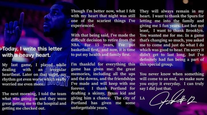 感谢篮球带给我的一切,那些美妙的回忆,那些起起伏伏,还有那些友情,会伴我到老。感谢开拓者选择这个来自德州的羸弱的小男孩并给他机会,波特兰这座城市给了我太多难忘的回忆。