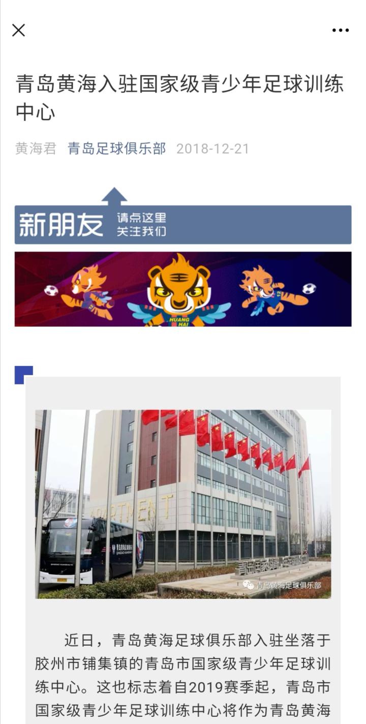 2018年12月21日,青岛黄海(现青岛足球俱乐部)正式宣布入驻青岛国家级青少年足球训练中心。