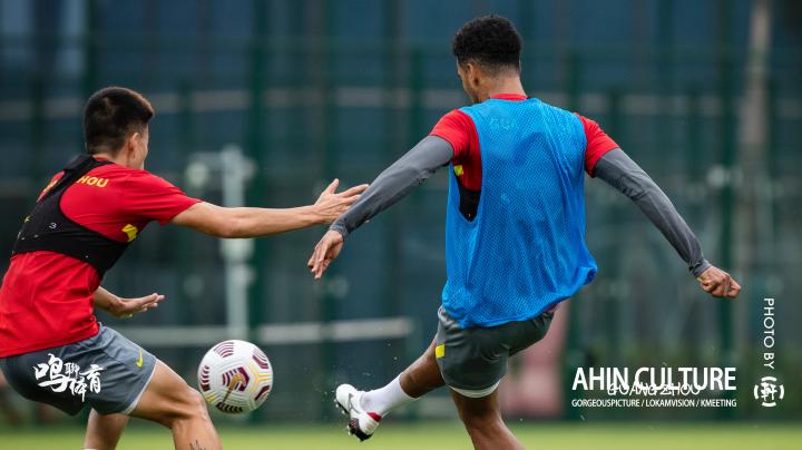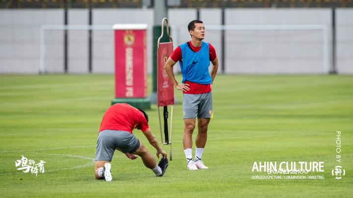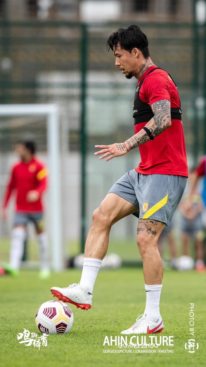 简单的热身后马上进入有球分组对抗环节。众所周知,新基地的硬件条件特别好,草坪更是一级棒,广州队球员被分成蓝红两组,开始了从后场推进到前场的进攻演练,而这过程中要求大家尽力用一脚传球完成,练的是传控技术,练的也是默契度。由于太长时间没看到球队实战,也不清楚球队近期发展动态,所以对于新赛季广州队的阵容以及人员使用,大多数人是模糊不清的。通过这次公开训练,笔者在场边认真观察了在分组对抗中球员的站位及作用。