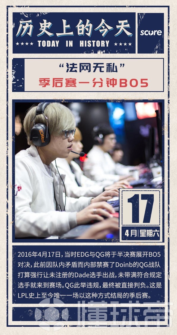 峡谷全视野在五年前的今天——2016年4月17日的2016LPL春季赛季后赛之中,QG因中单未到场而直接被LPL官方判负,对手EDG直接晋级总决赛会师RNG,这也是一分钟Bo5的由来。