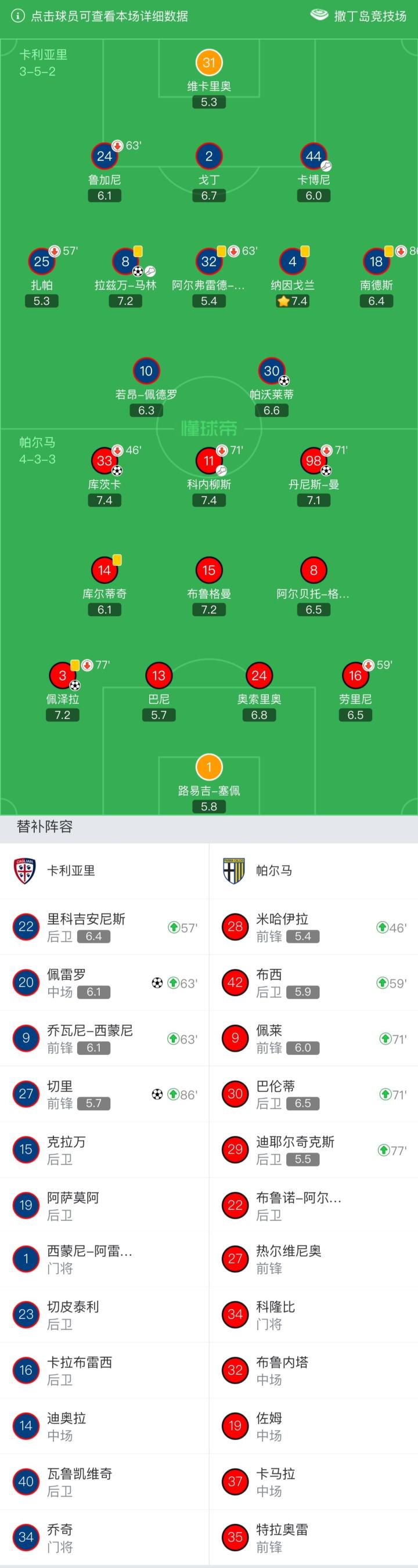 卡利亚里首发:31-维卡里奥、2-戈丁、44-卡博尼、24-鲁加尼(63`20-佩雷罗)、25-扎帕(57`22-里科吉安尼斯)、8-拉兹万-马林、32-阿尔弗雷德-邓肯(63`9-乔瓦尼-西蒙尼)、4-纳因戈兰、18-南德斯(86`27-切里)、10-若昂-佩德罗、30-帕沃莱蒂