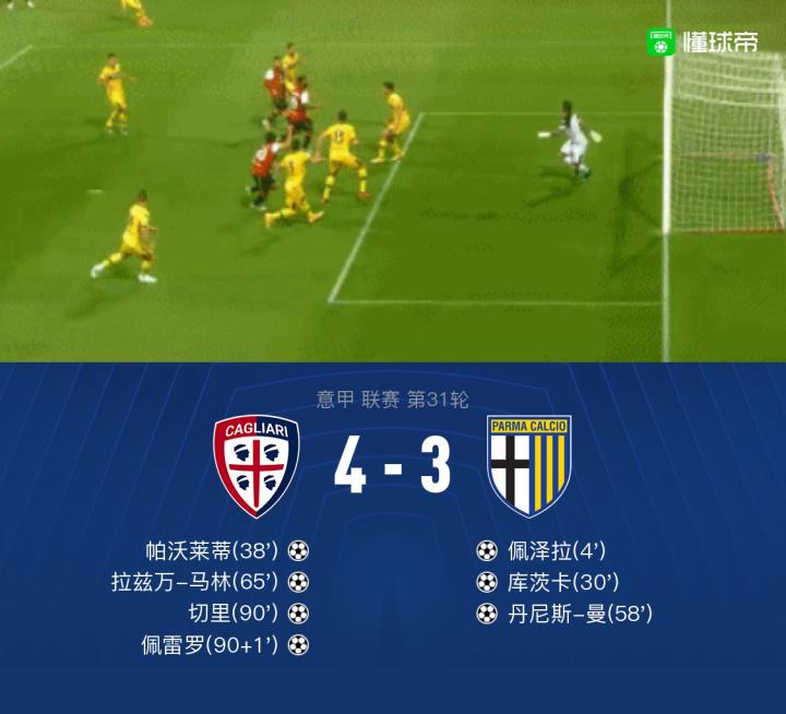 北京时间4月18日2:45,意甲第31轮,卡利亚里主场迎战帕尔马。上半场,佩泽拉抽射破门,拉兹万-马林远射被扑,库茨卡推射破门,帕沃莱蒂头球建功。下半场,丹尼斯-曼远射破门,拉兹万-马林抽射建功,切里替补绝杀,最终,帕尔马3-4卡利亚里。