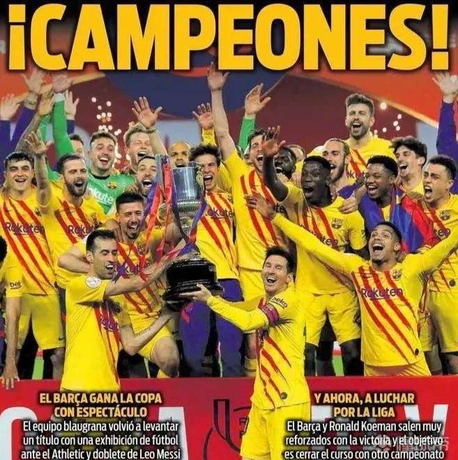 4月18日3时30分,2020-2021西班牙国王杯决赛在毕尔巴鄂竞技主场进行,毕尔巴鄂竞技迎战巴塞罗那。 巴萨方面,梅西领衔,格列兹曼、阿尔巴、德容首发。比赛第59分钟,德容助攻格列兹曼首开记录;第62分钟,德容头球再下一城;第68分钟,梅西锦上添花打入一球;第72分钟,阿尔巴助攻梅西再进一球,最终,毕尔巴鄂竞技0:4巴塞罗那,赢得了2020-2021西班牙国王杯冠军! 梅西再次发挥了他的巨星作用,“梅”开二度为球队锁定胜局。巴萨的传球行云流水,在节奏感、默契度、传控率等方面都胜对方几倍,最后赢得国王杯冠军也是众望所归,是实力使然! 巴萨赢得国王杯冠军也是一路磕磕碰碰,有些场次险些阴沟里翻船,还好在关键的场次有关键的球员及时的站出来,大家共同使比赛发生逆转,改写球队的命运,最终迎来胜利的荣光!