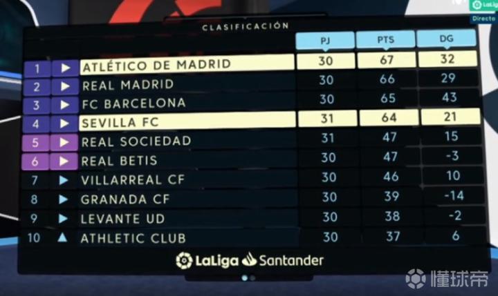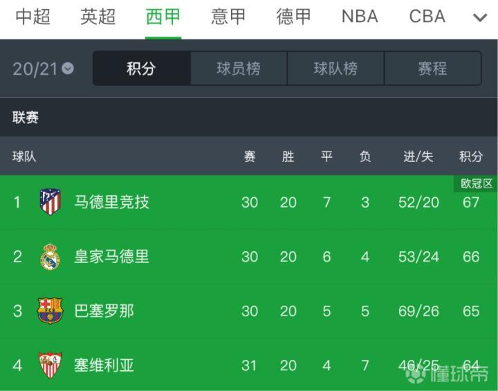 目前西甲最新积分榜上,马竞、皇马、巴萨、塞维利亚的差距各只有1分,分别是67分、66分、65分、64分。