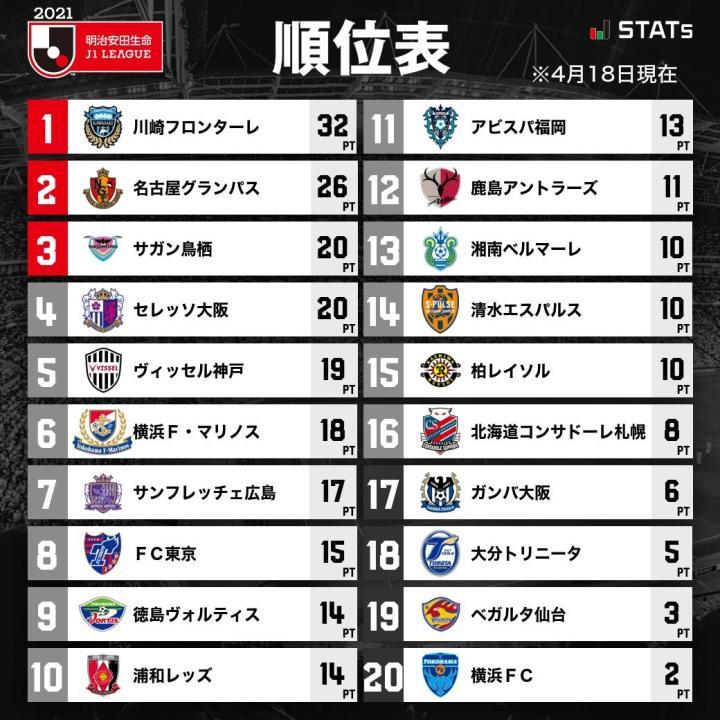 北京时间4月18日,2021赛季J1联赛第10轮的比赛全部结束。川崎前锋主场1-1被广岛三箭逼平,仍然位居榜首;名古屋鲸鱼主场1-2不敌鸟栖砂岩,遭遇赛季首败,连续零封的时长也停留在了823分钟;鹿岛鹿角客场1-0小胜德岛漩涡,町田浩树建功;横滨水手客场3-1逆转北海道札幌冈萨多。