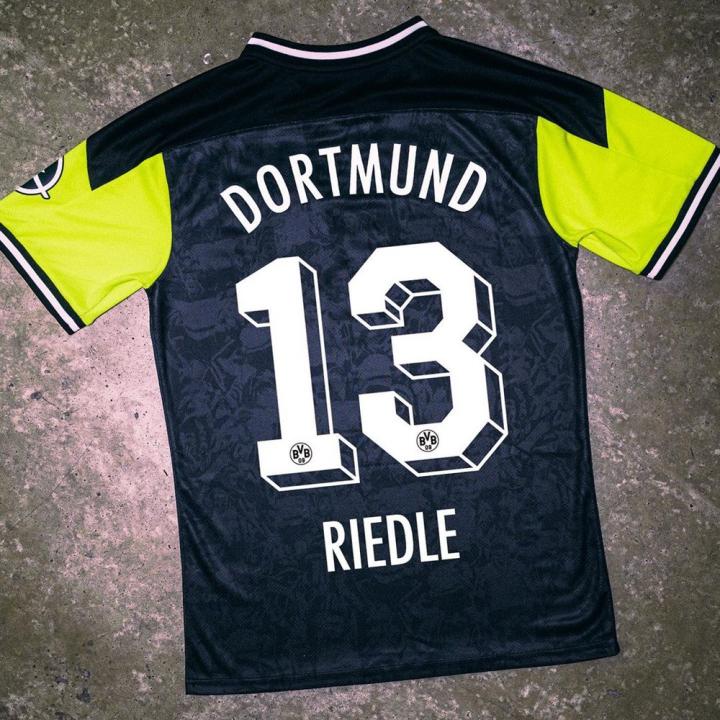 这件限量版球衣只用于这场与云达不来梅的德甲联赛,旨在纪念上世纪90年代缔造俱乐部辉煌时代的那些绿茵英雄们。迈克尔·佐科(Michael Zorc)、卡尔-海因茨·里德尔(Karl-Heinz Riedle)、拉尔斯·里肯(Lars Ricken)、蒂亚斯·萨默尔(Matthias Sammer)、儒里奥·塞萨尔(Julio Cesar)、克努特·莱茵哈特(Knut Reinhardt)、斯蒂芬·查普伊萨特(Stephane Chapuisat)、斯特凡·克洛斯(Stefan Klos)、约尔格·海因里希(Jörg Heinrich)、保罗·兰伯特(Paul Lambert)、弗莱明·波尔森(Flemming Povlsen)、保罗·索萨(Paulo Sousa)、赫科·赫尔里希(Heiko Herrlich)和金特·科托夫斯基(Günter Kutowski)这些多特蒙德名宿的群像出现在这件限量版球衣上,同时球衣还附上“Jede Ära beginnt mit dem Willen ihrer Helden”(每个时代都始于英雄的意志)的语句。