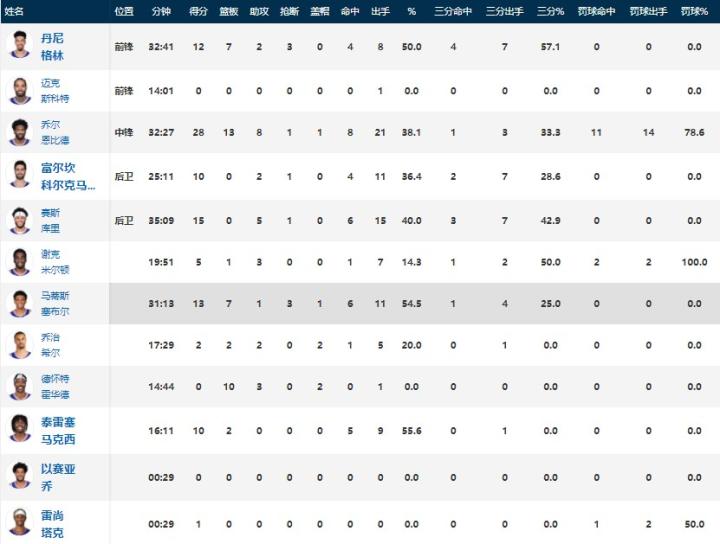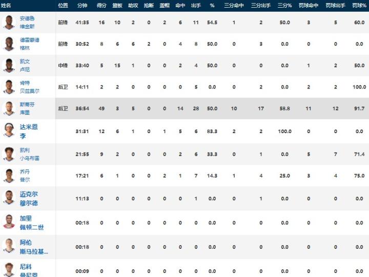 数据方面,勇士这边库里49分5篮板,维金斯16分10篮板,鲁尼5分15篮板,达米安-李12分6篮板;76人这边恩比德28分13篮板8助攻,塞思-库里15分5篮板,丹尼-格林12分7篮板,科尔克马兹10分,马克西10分,霍华德10篮板,塞布尔13分7篮板。