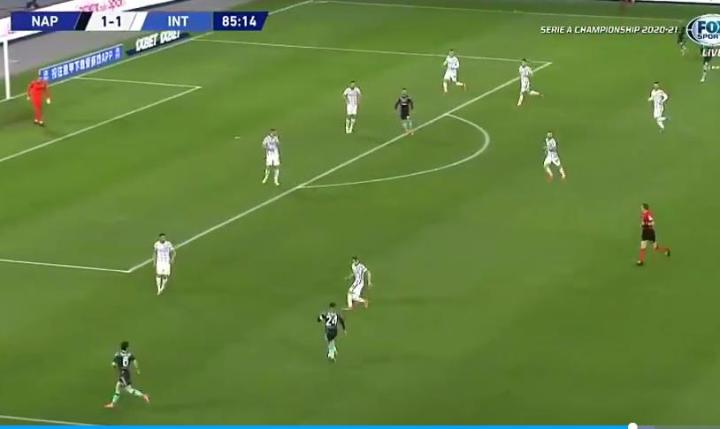 本场比赛,因西涅左路强行下底传中,汉达诺维奇扑救时与德弗赖相撞脱手,皮球滚入网窝。阿什拉夫右路传中滑门而过,达米安再传中也被解围,埃里克森禁区前沿张弓搭箭,远射破门!那不勒斯1-1国际米兰。
