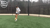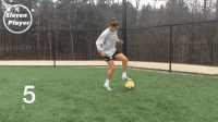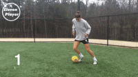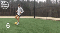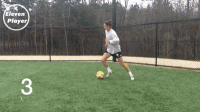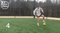 ❹ 再用右脚脚底将球从左脚之后做一个克鲁伊夫变向扣球。【变向】
