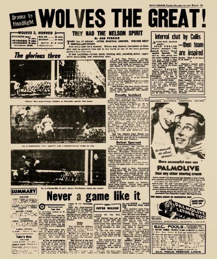 在这样势不可挡的劲头下,1954年12月13日,匈牙利冠军洪韦德驾临莫利纽球场。匈牙利国家队在当年获得了世界杯亚军,当届世界杯最佳球员普斯卡什、最佳射手柯奇士都在洪韦德阵中,可以说来者不善。同时这场比赛也被英格兰上下视为国家自尊心的一战,因为在过去的一年内,英格兰国家队先后以3-6和1-7的比分两次惨败在匈牙利脚下。