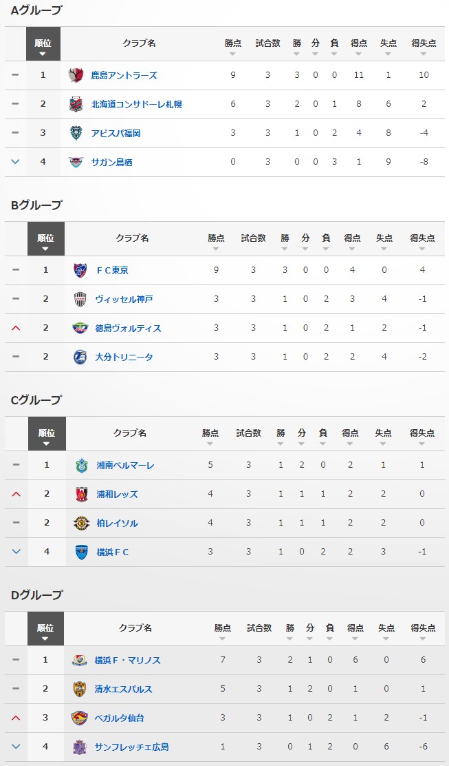 北京时间4月21日,2021赛季日联杯第三轮的比赛全部结束。鹿岛鹿角3-0完胜北海道札幌冈萨多,三战全胜位列A组头名;FC东京客场1-0击败大分三神,三战全胜高居B组榜首;仙台七夕客场1-0击败广岛三箭,拿下本赛季的首场胜利;福冈黄蜂客场1-0送鸟栖砂岩日联杯三连败,笑傲“九州德比”。