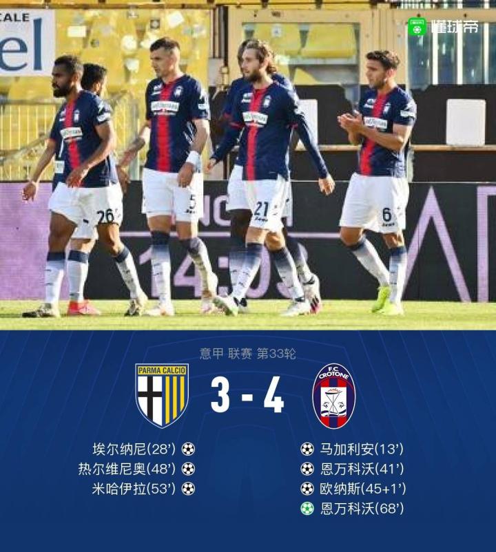 克罗托内客场4-3帕尔马终结6连败,恩万科沃双响,欧纳斯传射