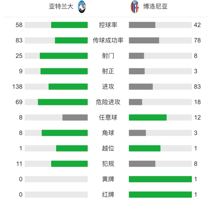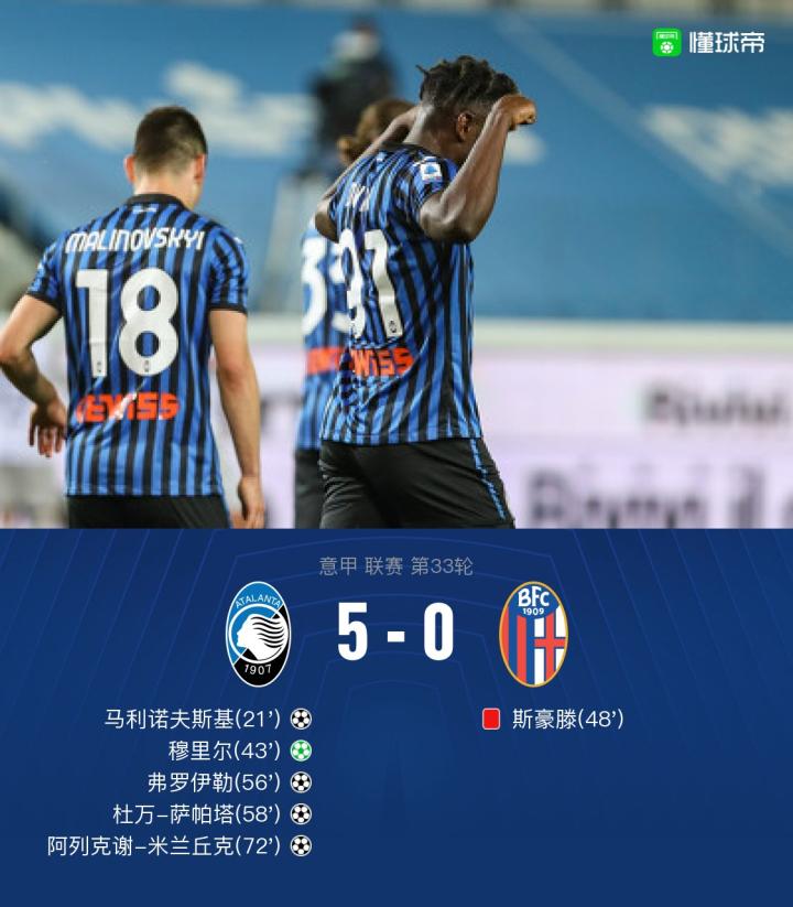 亚特兰大5-0博洛尼亚,穆里尔传射,萨帕塔、米兰丘克破门