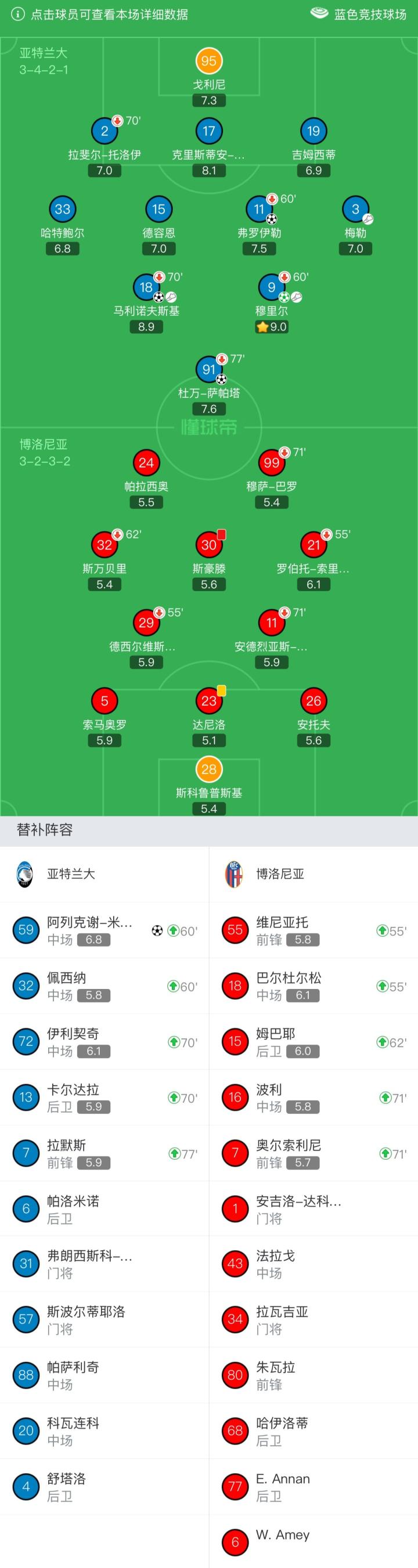 亚特兰大首发:95-戈利尼、2-拉斐尔-托洛伊(70`13-卡尔达拉)、19-吉姆西蒂、17-克里斯蒂安-罗梅罗、33-哈特鲍尔、11-弗罗伊勒(60`32-佩西纳)、15-德容恩、3-梅勒、18-马利诺夫斯基(70`72-伊利契奇)、9-穆里尔(60`59-阿列克谢-米兰丘克)、91-杜万-萨帕塔(77`7-拉默斯)