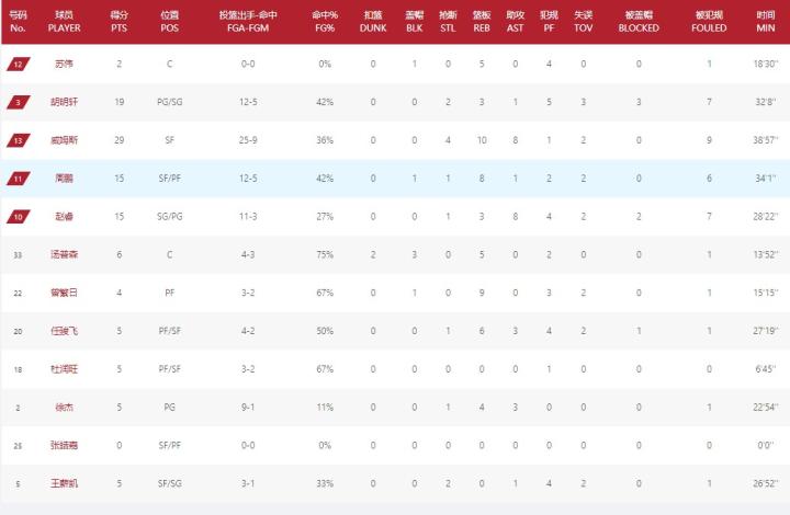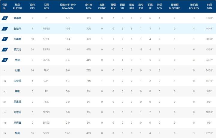 数据方面,广东队这边,威姆斯28分10篮板8助攻,胡明轩19分3篮板,周鹏15分8篮板,赵睿15分3篮板8助攻;辽宁队这边郭艾伦24分13助攻,付豪24分5篮板,OJ-梅奥16分8篮板,张镇麟10分5篮板。最后,胡明轩获得FMVP!
