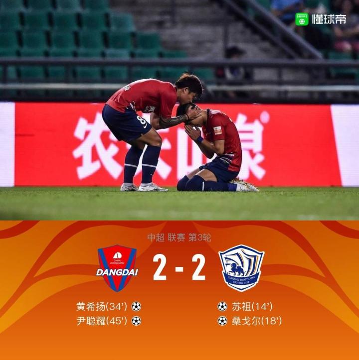重庆连扳两城2-2沧州,两队均未尝胜绩,黄希扬任意球世界波